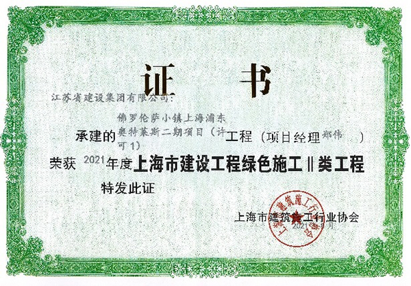 佛羅倫薩小鎮項目獲得上海市綠色施工II類工程獎